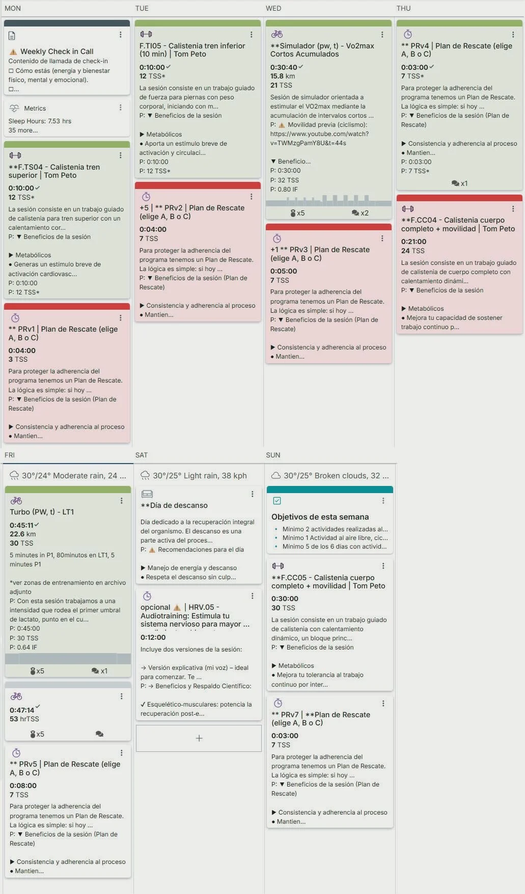 El entrenamiento del día es una sesión de fortalecimiento de 45 min para el tren superior, la opción de rescate son 10 flexiones + 45 segundos de plancha. Para una corrida de 45 min, el plan de rescate puede ser subir las escaleras de los 12 pisos hasta el apartamento, obviar el ascensor. Lo importante es que sea lo suficientemente fácil para desactivar excusas y que esté bien integrada a tus movimientos/rutinas del día. Abajo te dejo una imagen de como se ve una semana así.