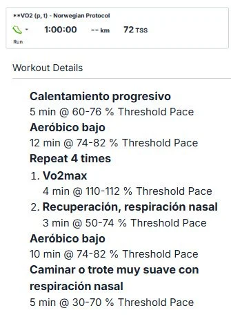 Te dejaré por aquí dos audiotrainings que diseñé, uno es para visualizar un entrenamiento de atletismo conocido como el protocolo noruego, si eres atleta probablemente lo conoces. Son 4 series de 4 minutos intensos, es probadamente uno de los entrenamientos más efectivos para aumentar tu techo fisiológico y, al ser una sesión exigente y con alta cuota de falla, visualizarlo previamente hace toda la diferencia. Te dejo (abajo) una foto que resume el entrenamiento y el audio para visualizarlo aquí.
